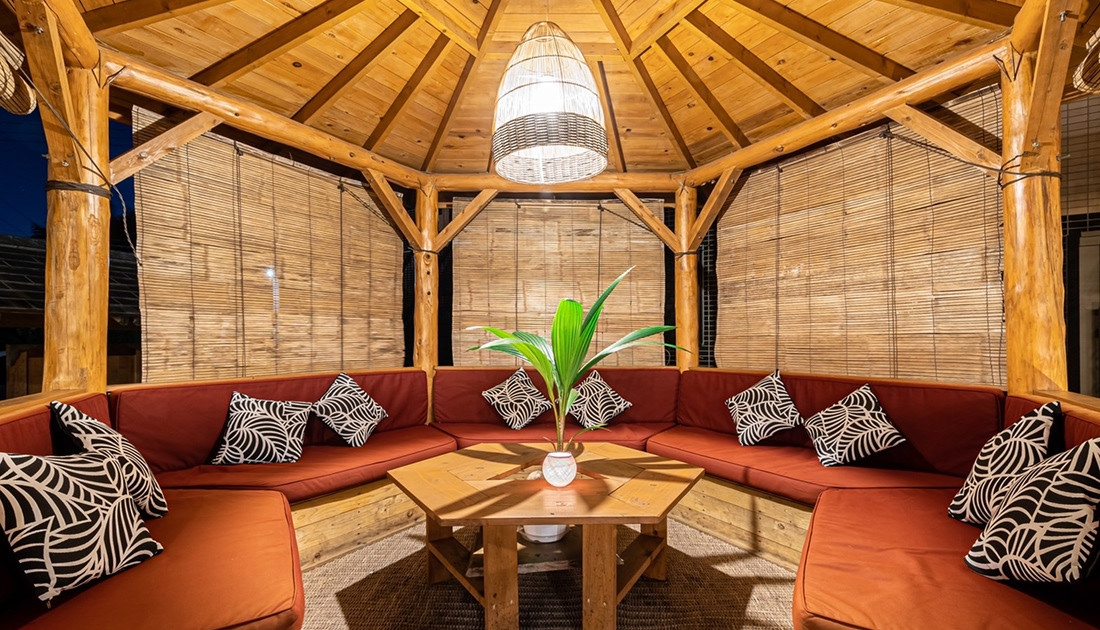雨の日でも安心してBBQができ、冬にはガゼボに大型コタツも登場。