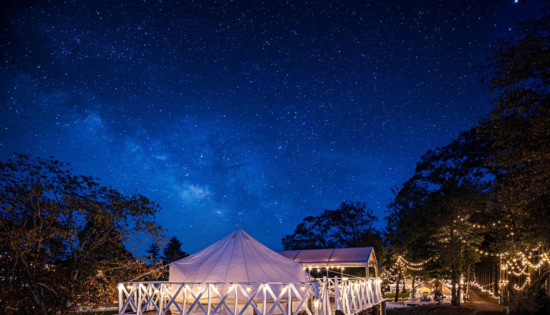 ウッドデッキの高台に設置された大型テントには、ホテル並みのアメニティが完備されており、手ぶらで本格的なアウトドア体験が可能です。