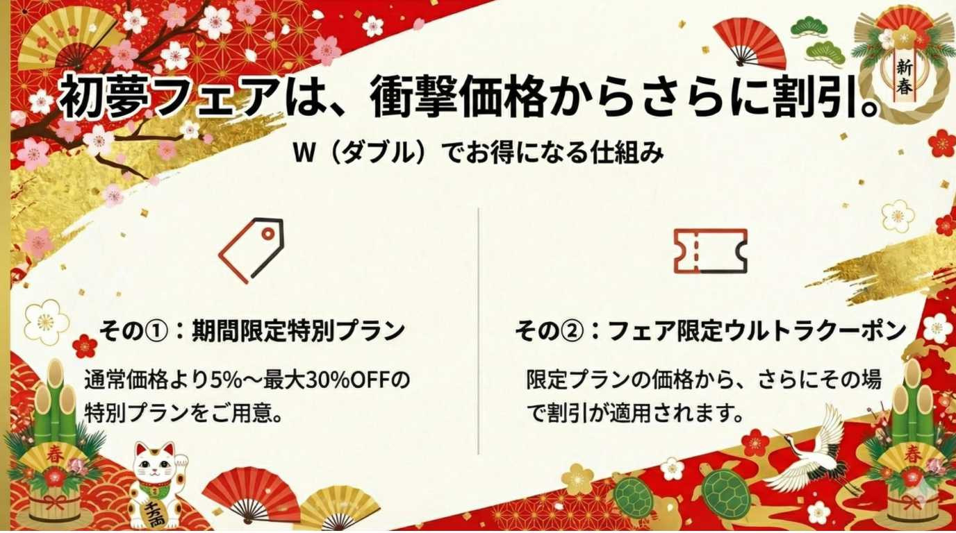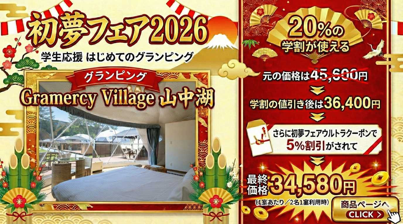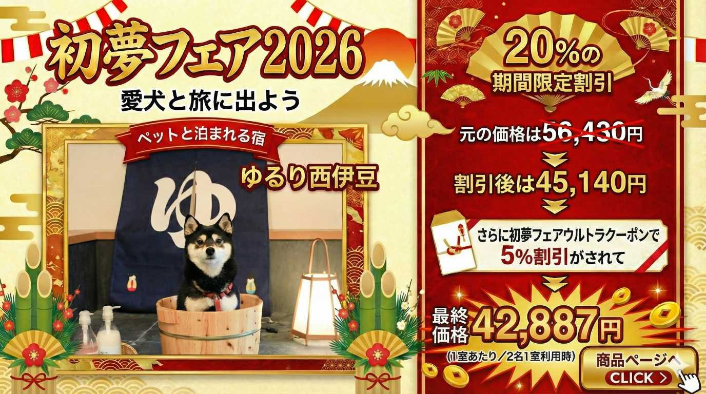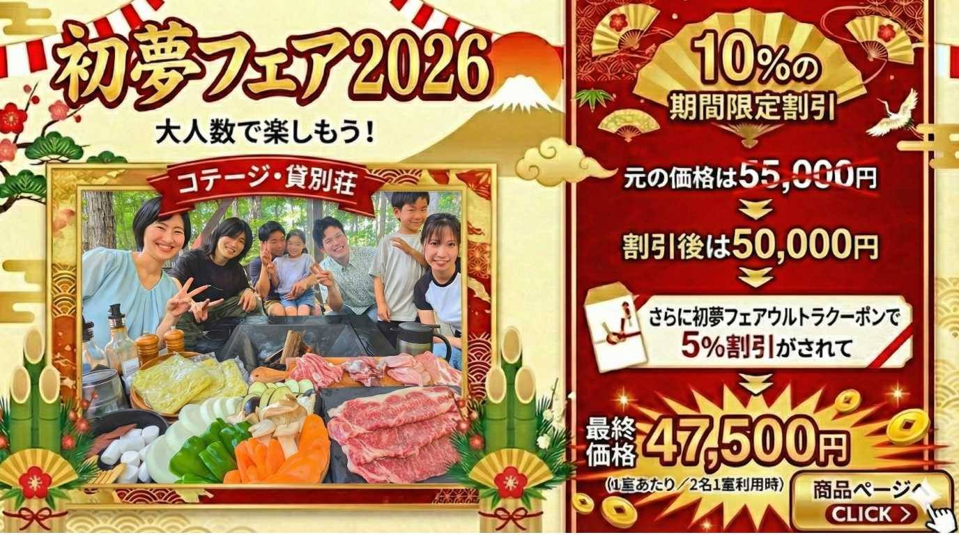 初夢フェア2026 . . . . . . . . . . . . . . . . 2026.01.09 #グランピング #バケーションレンタル WOW+の初夢フェアは ここがすごい! 年に一度のビッグセール。 憧れのあのお宿が、 W(ダブル)でお得に。 ~目次~ 1.ひとめでわかるWOW+初夢フェアビジュアル解説 2.HISのWOW+とは? 3.WOW+初夢フェアの内容は? 4.初夢フェア限定プランを探すには? 5.注目の宿をピックアップ 6.まとめ #関東近郊 #関西近郊 #グランピング #貸別荘 #ヴィラ #ペットと泊まる 1.ひとめでわかるWOW+初夢フェアビジュアル解説 より詳しく WOW+の初夢フェアを知りたい方は以下をお読みください。 2.HISのWOW+とは? 3.WOW+初夢フェアの内容は? 4.初夢フェア注目の宿 ※料金は条件によって変動しますので必ずご確認ください。 5.初夢フェア限定プランを探すには? 6.まとめ この記事をシェアする この記事のURLとタイトルをコピーする 前へ 一覧へ戻る 次へ 人気の記事 1 広島県尾道市百島の楽園、「瀬戸内隠れ家リゾート」の魅力を紹介 2025.11.27 2 都心から90分!「SPRINGS VILLAGE 足柄・丹沢リゾート&グランピング」で贅沢なひとときを 2025.11.27 3 初夢フェア2026 2026.01.09 4 海士町の隠れ家グランピング「TADAYOI」で自然と歴史を満喫」 2025.11.27 5 「ヴィラ ポルトアジュール 那須」美人の湯と絶景BBQで極上のリラクゼーションを 2025.11.27 タグ一覧 #貸別荘・コテージ #ペットと泊まる #温泉 #北陸 #中部 #沖縄 #中四国 #ラグジュアリー #田舎暮らし #サウナ #焚き火 #プール #町屋 #ヴィラ #古民家 #離島泊 #寺泊 #農泊 #バケーションレンタル #グランピング #北海道 #東北 #九州 #淡路島 #軽井沢 #千葉 #関西 #関東 #BBQ