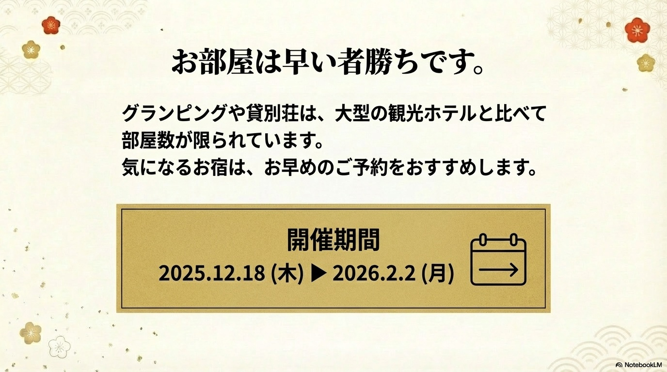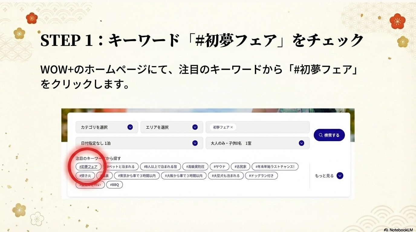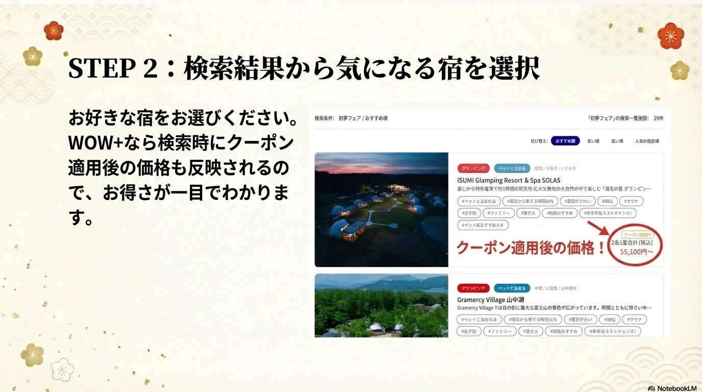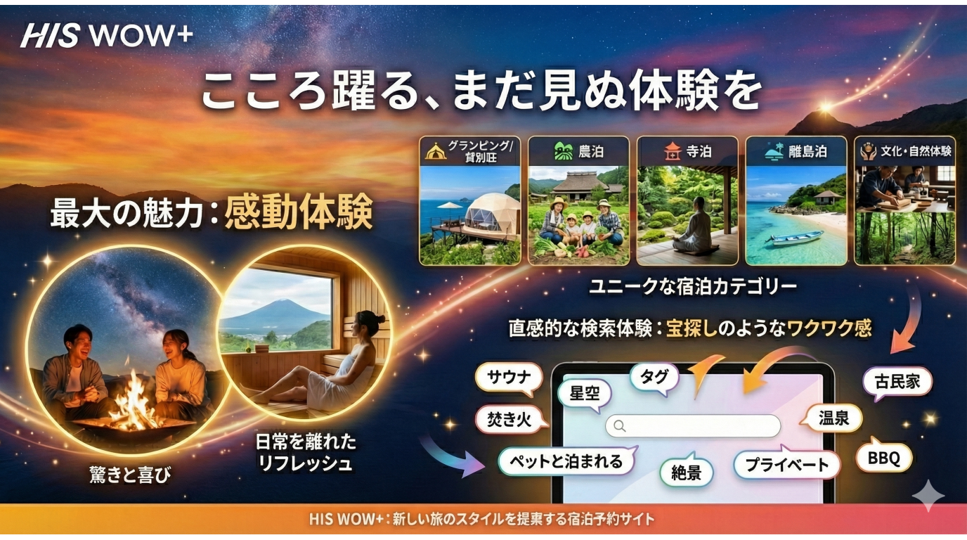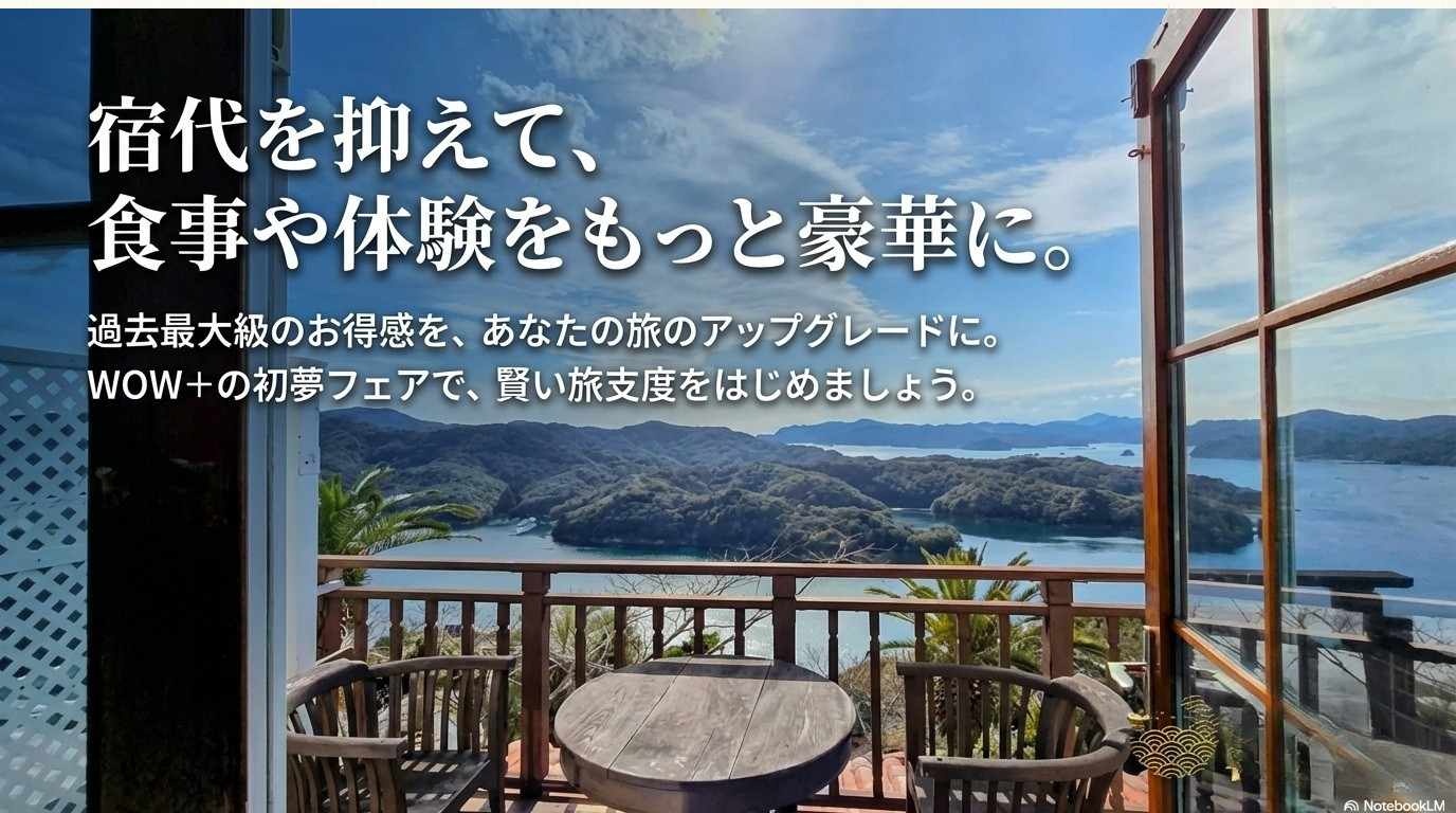 初夢フェア2026 . . . . . . . . . . . . . . . . 2026.01.09 #グランピング #バケーションレンタル WOW+の初夢フェアは ここがすごい! 年に一度のビッグセール。 憧れのあのお宿が、 W(ダブル)でお得に。 ~目次~ 1.ひとめでわかるWOW+初夢フェアビジュアル解説 2.HISのWOW+とは? 3.WOW+初夢フェアの内容は? 4.初夢フェア限定プランを探すには? 5.注目の宿をピックアップ 6.まとめ #関東近郊 #関西近郊 #グランピング #貸別荘 #ヴィラ #ペットと泊まる 1.ひとめでわかるWOW+初夢フェアビジュアル解説 より詳しく WOW+の初夢フェアを知りたい方は以下をお読みください。 2.HISのWOW+とは? 3.WOW+初夢フェアの内容は? 4.初夢フェア注目の宿 ※料金は条件によって変動しますので必ずご確認ください。 5.初夢フェア限定プランを探すには? 6.まとめ この記事をシェアする この記事のURLとタイトルをコピーする 前へ 一覧へ戻る 次へ 人気の記事 1 広島県尾道市百島の楽園、「瀬戸内隠れ家リゾート」の魅力を紹介 2025.11.27 2 都心から90分!「SPRINGS VILLAGE 足柄・丹沢リゾート&グランピング」で贅沢なひとときを 2025.11.27 3 初夢フェア2026 2026.01.09 4 海士町の隠れ家グランピング「TADAYOI」で自然と歴史を満喫」 2025.11.27 5 「ヴィラ ポルトアジュール 那須」美人の湯と絶景BBQで極上のリラクゼーションを 2025.11.27 タグ一覧 #貸別荘・コテージ #ペットと泊まる #温泉 #北陸 #中部 #沖縄 #中四国 #ラグジュアリー #田舎暮らし #サウナ #焚き火 #プール #町屋 #ヴィラ #古民家 #離島泊 #寺泊 #農泊 #バケーションレンタル #グランピング #北海道 #東北 #九州 #淡路島 #軽井沢 #千葉 #関西 #関東 #BBQ