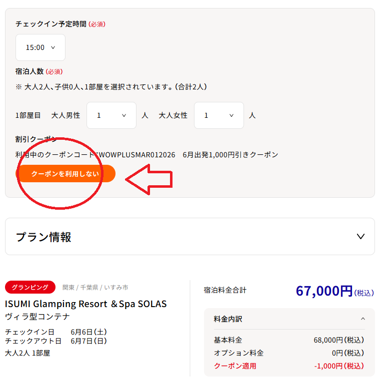 ④オレンジ色のクーポンを利用しないボタンを押し、適用を解除
