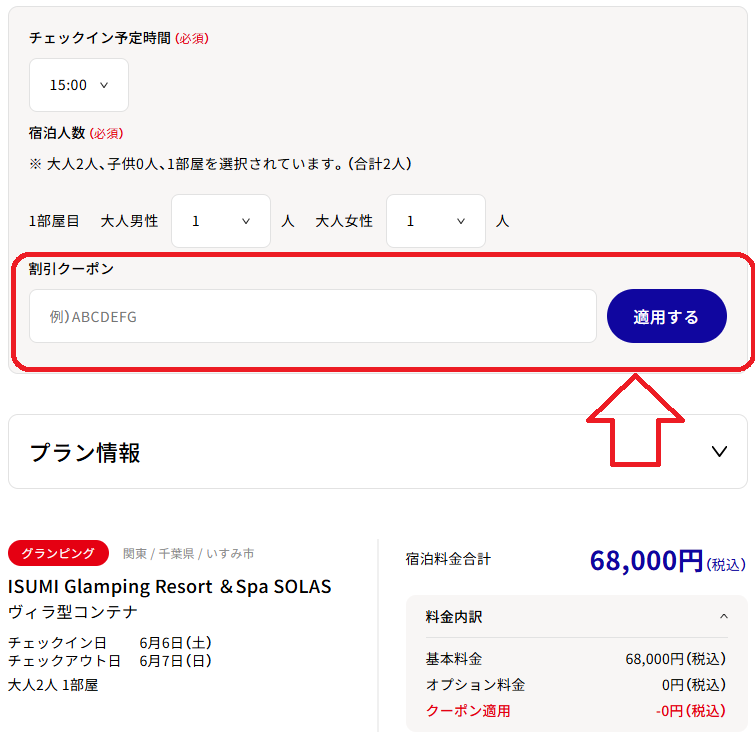 ②施設情報入力画面で見つけたクーポン番号を入力し、適用するをクリック