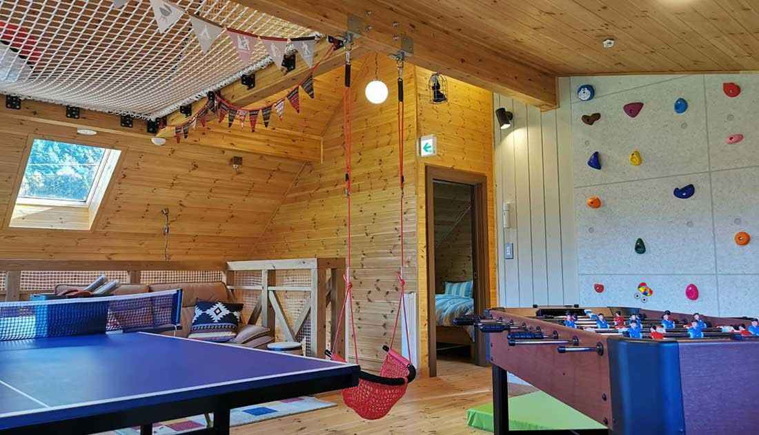 また、2階にはボルダリングやブランコ、卓球台などの遊具が揃っており、子どもたちも飽きることなく遊べる空間が広がっています。